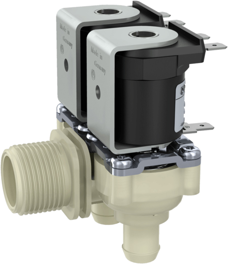 U bevindt zich hier » Productencatalogus » A.u.K. Müller » Magneetventielen » Magneetventielen Kunststof » Magneetventielen indirect gestuurd » Magneetventiel, kunststof, indirect gestuurd (Servo), NC, DN10, dubbel haaks, draad / Tule