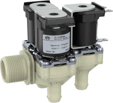 U bevindt zich hier » Productencatalogus » A.u.K. Müller » Magneetventielen » Magneetventielen Kunststof » Magneetventielen indirect gestuurd » Magneetventiel, kunststof, indirect gestuurd (Servo), NC, DN10, drievoudig haaks, Tule / draad