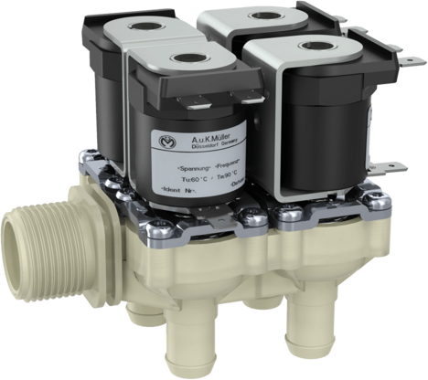 U bevindt zich hier » Productencatalogus » A.u.K. Müller » Magneetventielen » Magneetventielen Kunststof » Magneetventielen indirect gestuurd » Magneetventiel, kunststof, indirect gestuurd (Servo), NC, DN10, viervoudig haaks, Tule / draad