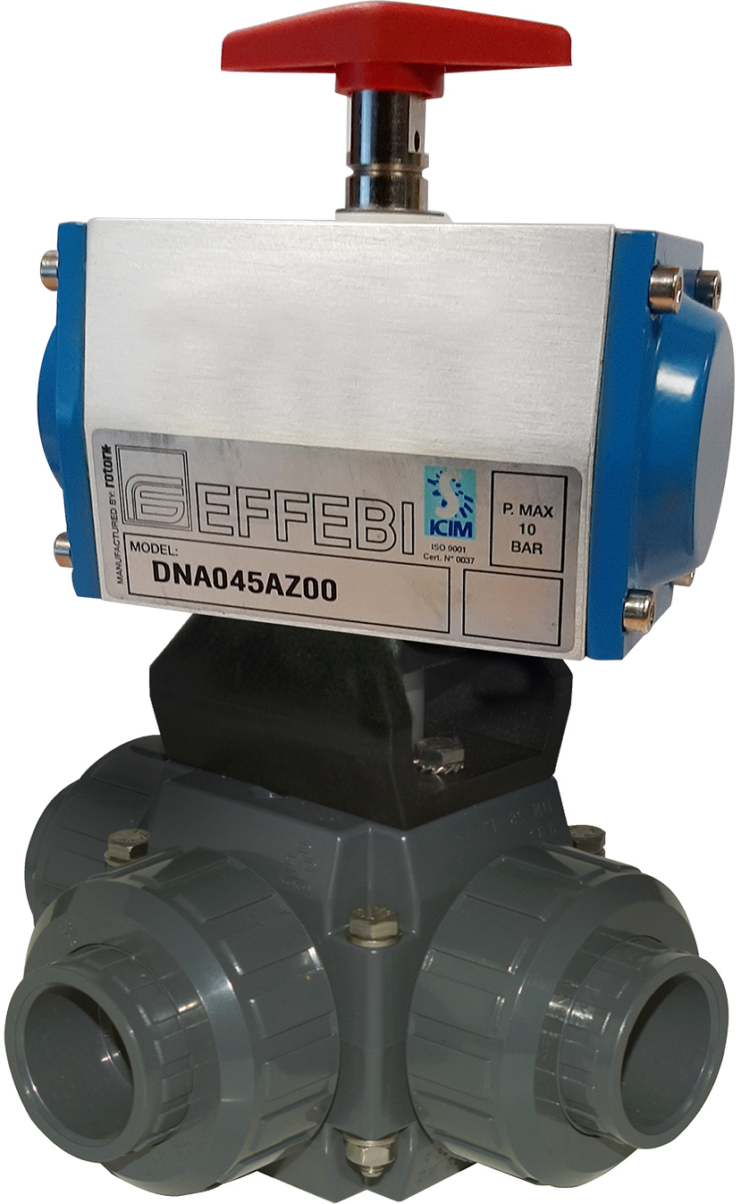 U bevindt zich hier » Productencatalogus » Effebi » Pneumatische PVC kogelafsluiters » PVC Kogelkraan, 3-weg, lijmaansluiting, ISO, L-boring, pneumatisch enkelwerkend