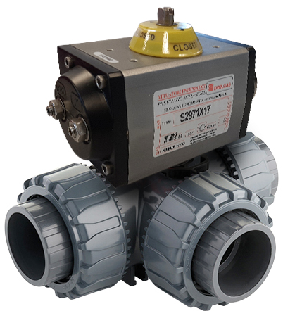 U bevindt zich hier » Productencatalogus » Enolgas » Pneumatische Kogelkranen » Pneumatische PVC kogelkranen » PVC Kogelkraan, 3-weg, draadaansluiting, ISO-Top, T-boring, pneumatisch enkelwerkend