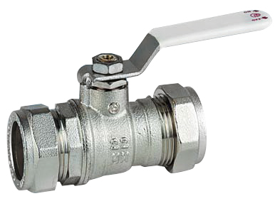 U bevindt zich hier » Productencatalogus » Fratelli Pettinaroli » Kogelafsluiters » 2-weg Kogelkranen » Kogelkraan, 2-weg, knel, messing verchroomd, volle doorlaat, witte hendel, normaal model