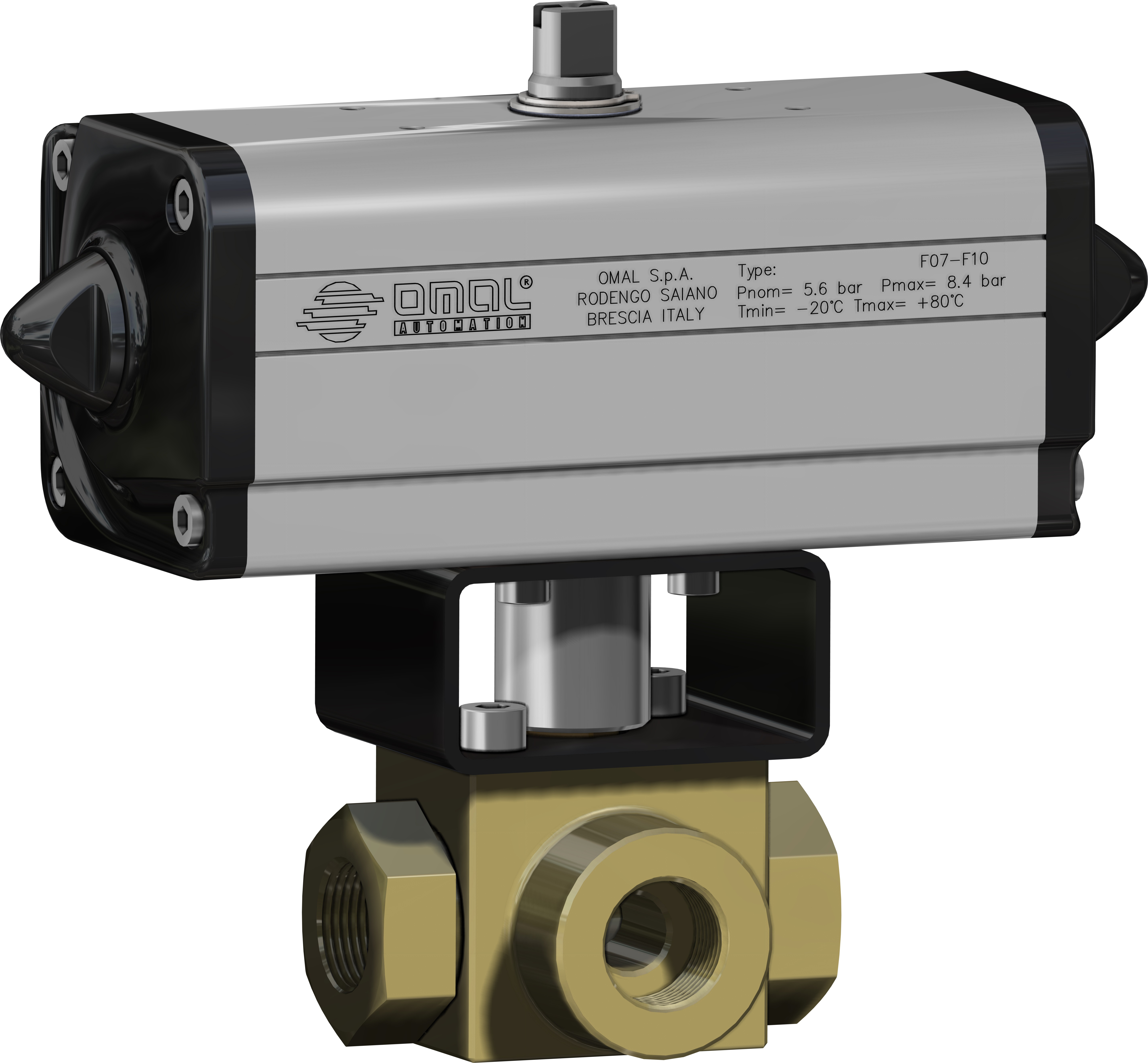 U bevindt zich hier » Productencatalogus » Omal » Pneumatisch bediende kogelafsluiters » Pneumatisch bediende hoge druk Kogelafsluiters » Dubbelwerkend hoge druk pneumatische kogelkranen » Pneumatische Kogelkraan, 3-weg, staal, hoge druk, binnendraad, dubbelwerkende aandrijving (DAN)