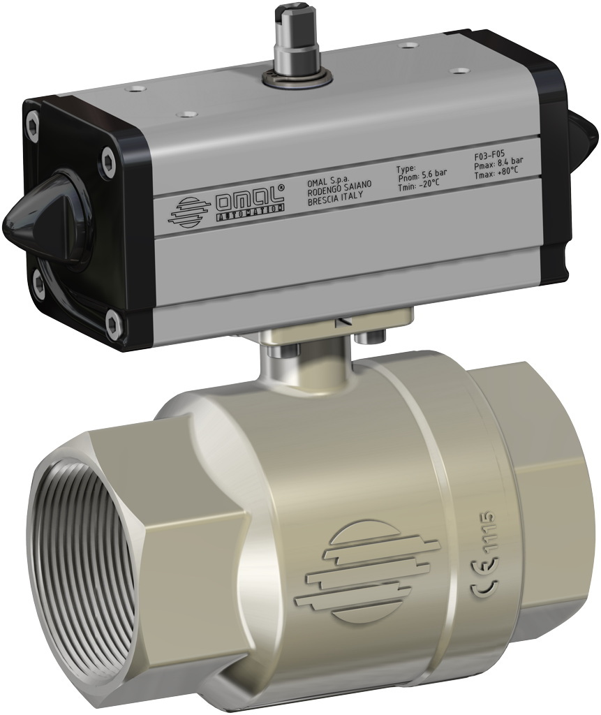 U bevindt zich hier » Productencatalogus » Omal » Pneumatisch bediende kogelafsluiters » Pneumatisch bediende messing Kogelafsluiters » Dubbelwerkende messing pneumatische kogelkranen » Pneumatische Kogelkraan, 2-weg, messing, binnendraad, dubbelwerkende aandrijving (DAN), zwaar model
