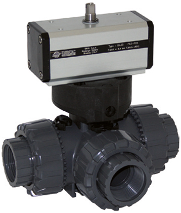 U bevindt zich hier » Productencatalogus » Omal » Pneumatisch bediende kogelafsluiters » Pneumatisch bediende PVC Kogelafsluiters » Dubbelwerkende PVC pneumatische kogelkranen » Pneumatische Kogelkraan, 3-weg, PVC, lijmaansluiting, T-boring, dubbelwerkende aandrijving (DA)