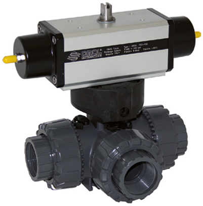 U bevindt zich hier » Productencatalogus » Omal » Pneumatisch bediende kogelafsluiters » Pneumatisch bediende PVC Kogelafsluiters » Enkelwerkende PVC pneumatisch kogelkranen » Pneumatische Kogelkraan, 3-weg, PVC, lijmaansluiting, T-boring, enkelwerkende aandrijving (SR)