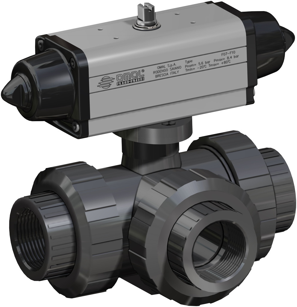 U bevindt zich hier » Productencatalogus » Omal » Pneumatisch bediende kogelafsluiters » Pneumatisch bediende PVC Kogelafsluiters » Enkelwerkende PVC pneumatisch kogelkranen » Pneumatische Kogelkraan, 3-weg, PVC, draadaansluiting, L-boring, enkelwerkende aandrijving (SRN)