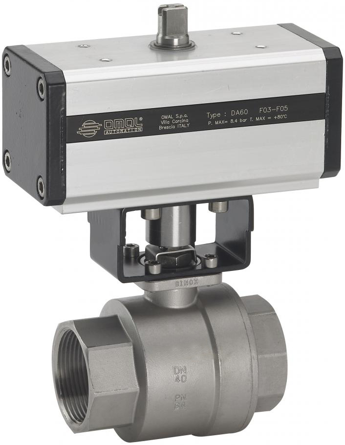 U bevindt zich hier » Productencatalogus » Omal » Pneumatisch bediende kogelafsluiters » Pneumatisch bediende RVS Kogelafsluiters » Dubbelwerkende RVS pneumatisch kogelkranen » Pneumatische Kogelkraan, 2-weg, RVS, draadaansluiting, gepolijst, dubbelwerkende aandrijving (DA)