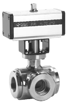 U bevindt zich hier » Productencatalogus » Omal » Pneumatisch bediende kogelafsluiters » Pneumatisch bediende RVS Kogelafsluiters » Dubbelwerkende RVS pneumatisch kogelkranen » Pneumatische Kogelkraan, 3-weg, RVS, draadaansluiting, L-boring, dubbelwerkende aandrijving (DA)