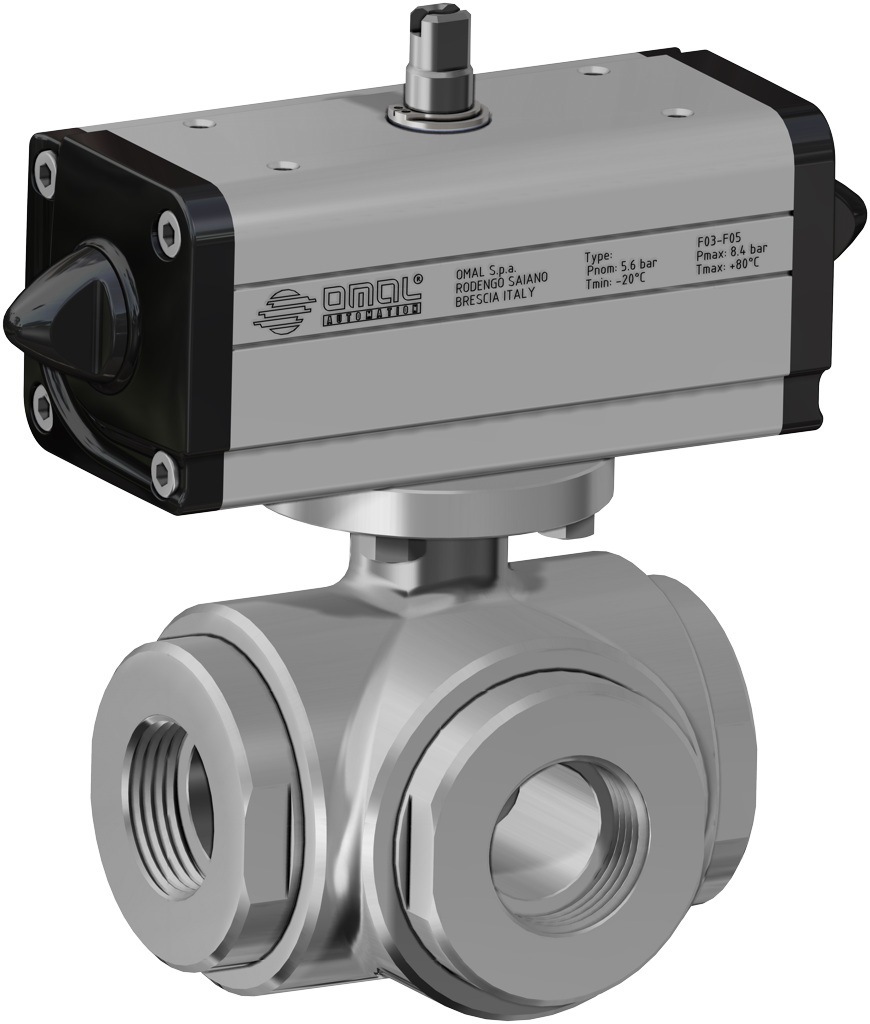 U bevindt zich hier » Productencatalogus » Omal » Pneumatisch bediende kogelafsluiters » Pneumatisch bediende RVS Kogelafsluiters » Dubbelwerkende RVS pneumatisch kogelkranen » Pneumatische Kogelkraan, 3-weg, RVS, draadaansluiting, L-boring, dubbelwerkende aandrijving (DAN)