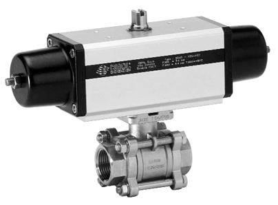 U bevindt zich hier » Productencatalogus » Omal » Pneumatisch bediende kogelafsluiters » Pneumatisch bediende RVS Kogelafsluiters » Enkelwerkende RVS pneumatisch kogelkranen » Pneumatische Kogelkraan, 2-weg, RVS, draad of lasaansluiting, 3-delig, enkelwerkende aandrijving