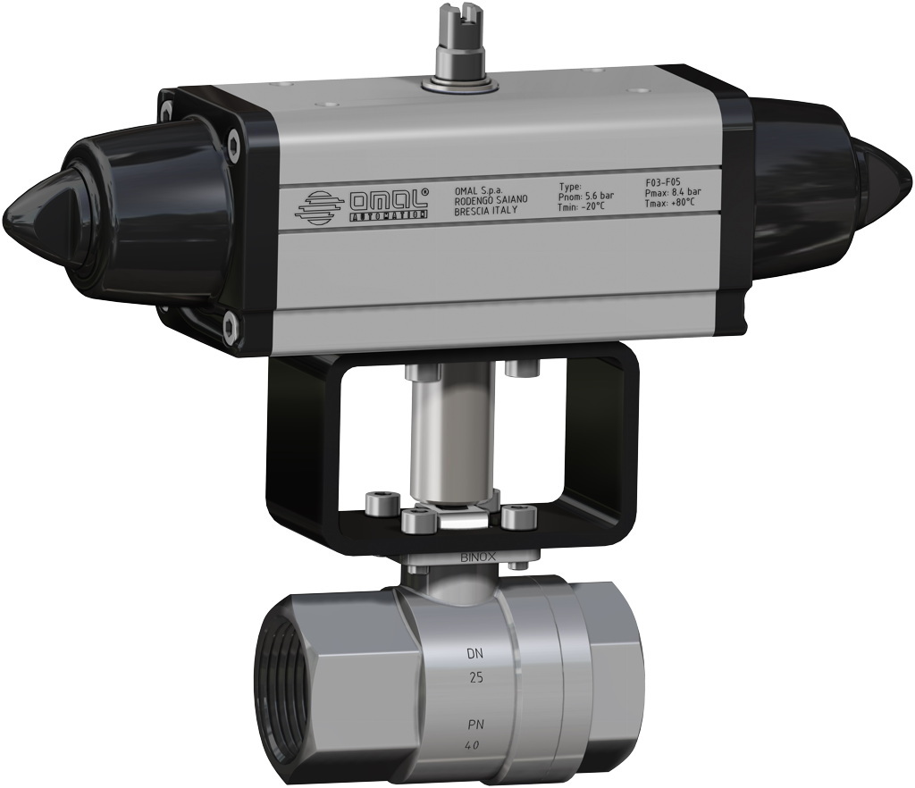 U bevindt zich hier » Productencatalogus » Omal » Pneumatisch bediende kogelafsluiters » Pneumatisch bediende RVS Kogelafsluiters » Enkelwerkende RVS pneumatisch kogelkranen » Pneumatische Kogelkraan, 2-weg, RVS, draadaansluiting, gepolijst, enkelwerkende aandrijving (SRN)