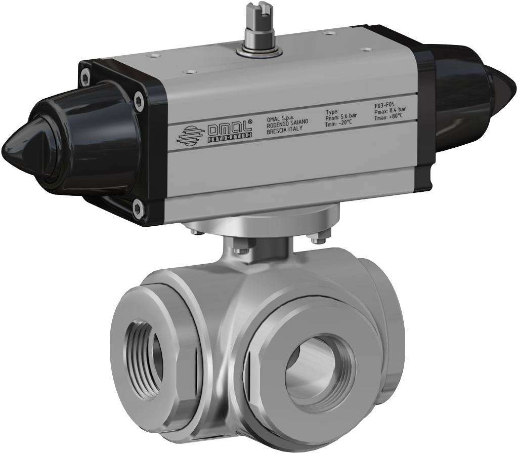 U bevindt zich hier » Productencatalogus » Omal » Pneumatisch bediende kogelafsluiters » Pneumatisch bediende RVS Kogelafsluiters » Enkelwerkende RVS pneumatisch kogelkranen » Pneumatische Kogelkraan, 3-weg, RVS, draadaansluiting, L-boring, enkelwerkende aandrijving (SRN)