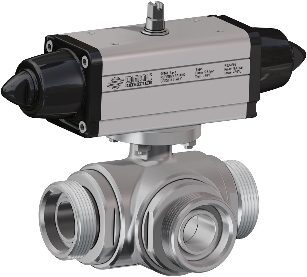 U bevindt zich hier » Productencatalogus » Omal » Pneumatisch bediende kogelafsluiters » Pneumatisch bediende RVS Kogelafsluiters » Enkelwerkende RVS pneumatisch kogelkranen » Pneumatische Kogelkraan, 3-weg, RVS, draadaansluiting, T-boring, Food, enkelwerkende aandrijving (SRN)