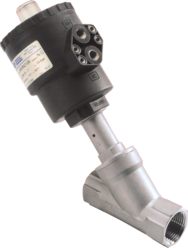 U bevindt zich hier » Productencatalogus » Omal » Pneumatisch bediende schuine Klepafsluiters » OMAL Pneumatisch bediende schuine Klepafsluiter, 2-weg, RVS, binnendraad, PN16 - 25 bar, Bidirectionaal, NC